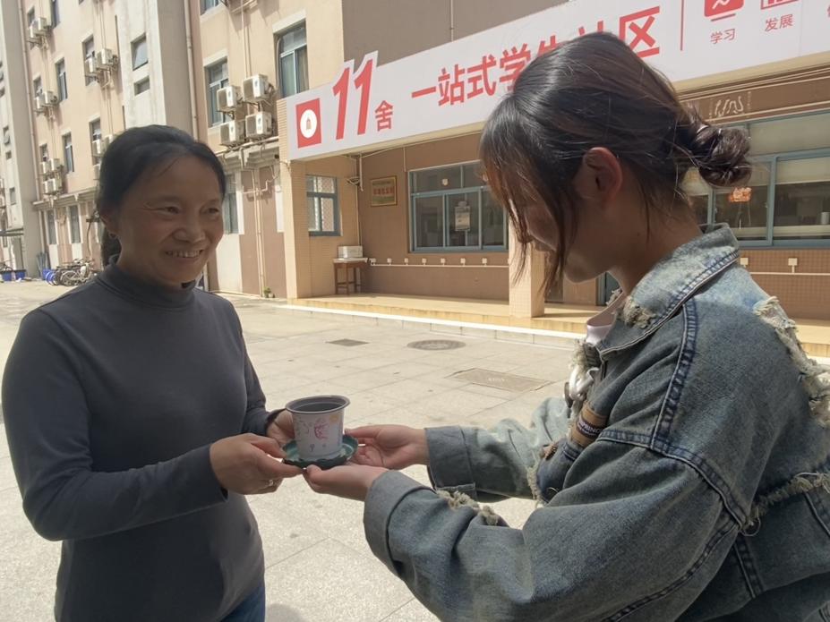 图为同学向宿管阿姨赠送盆栽