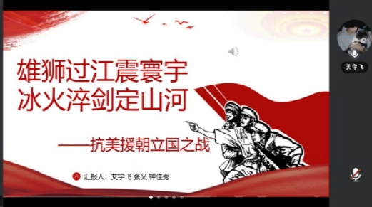 接下来是艾宇飞、张义、钟佳秀带来抗美援朝的党史分享。以视频播放引入,迅速将大家拉回到那个风云激荡的年代,让同学们对抗美援朝战争爆发原因,从纸面的文字认知,转变为直观的感同身受。小组成员以时间为线索,通过演讲的方式,结合照片和背景音乐,生动的讲述了抗美援朝战争的整个过程与其伟大的历史意义。同学们对志愿军的英勇事迹和抗美援朝精神有了更深的理解。