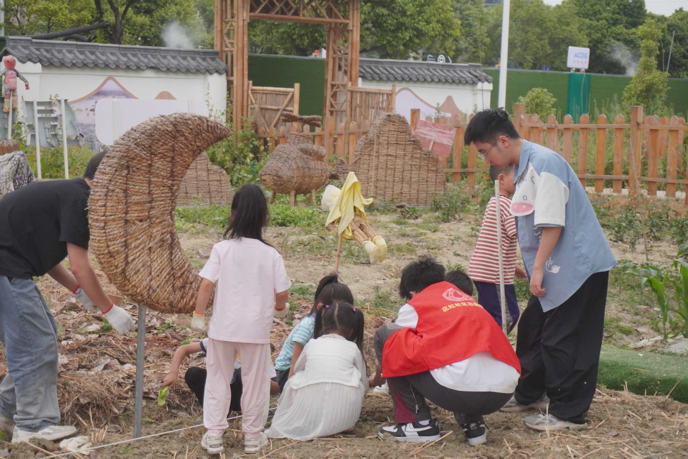 活动伊始,九班艾宇飞同学发言,对本次活动中社区和幼儿园的大力支持表示感谢。随后,十班张婧同学细心耐心地向小朋友们讲解了制作稻草人的步骤方法,从如何捆扎稻草,到怎样固定四肢和头部,每一步都详细示范。大家用稻草、扭扭棒等材料,充分发挥创意,制作出形态各异、栩栩如生的稻草人,有的像威武的战士,有的像可爱的动物,活动现场充满了欢声笑语。