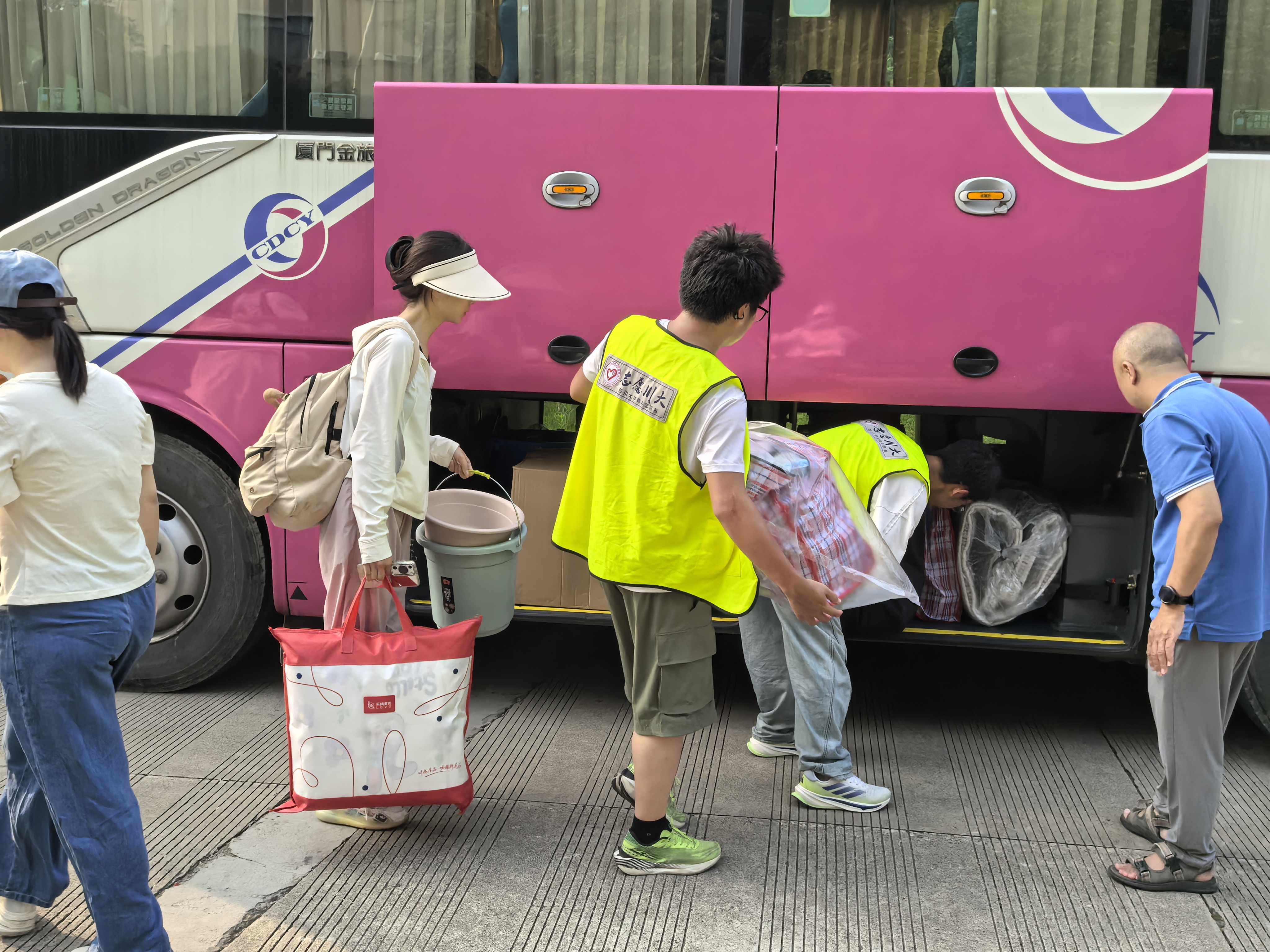 2024级的志愿者们穿梭于楼宇与校车停靠点之间,为2023级学长学姐的跨校区寝室搬迁工作提供了暖心助力。