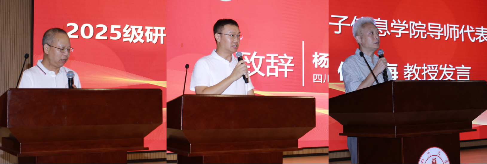 图 2 (从左至右)廖勇明副书记主持典礼,杨阳院长致辞,导师代表何小海教授发言