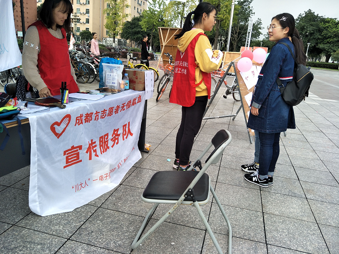 的同学们对于志愿者活动都献出了自己的一份力量,有的同学在下课后看到宣传活动的摊位后主动要求充当志愿者帮助分担大家的工作。志愿者活动虽是小事,但这其中不正是弘扬“奉献、友爱、互助、进步”的志愿者服务精神的过程吗?正是这样一个志愿者活动,为有爱心的川大学子提供了一个奉献爱心的大平台,让更多的同学体味到帮助他人的快乐。