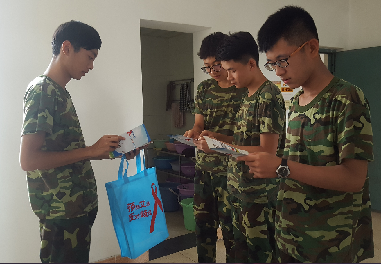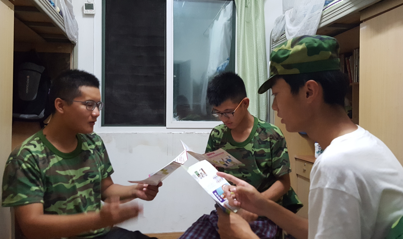 本次活动利用军训休息时间在电子信息男生围合展开,志愿者们于下午3点45在天井集合。负责人对志愿者工作进行安排,并告知了一些注意事项,之后志愿者们分工合作。4名志愿者负责在围合发放来自‘成都市疾病预防控制中心’的艾滋病相关知识宣传手册,手册中包含艾滋病的基本知识,传播途径和如何预防艾滋病。 晚上军事训练结束后,志愿者晚上十点在围合天井集合,后进入同学的大寝室内,为同学们佩戴上队员制作的红丝带,利用同学的休息时间在寝室客厅开展艾滋病知识宣传活动,调动各寝室的同学参与如何预防艾滋的讨论,同时讨论如何正确对待患有艾滋病的人群,让同学们对艾滋病有更深入的了解。活动到晚上十一点时结束,志愿者们回到各自寝室。