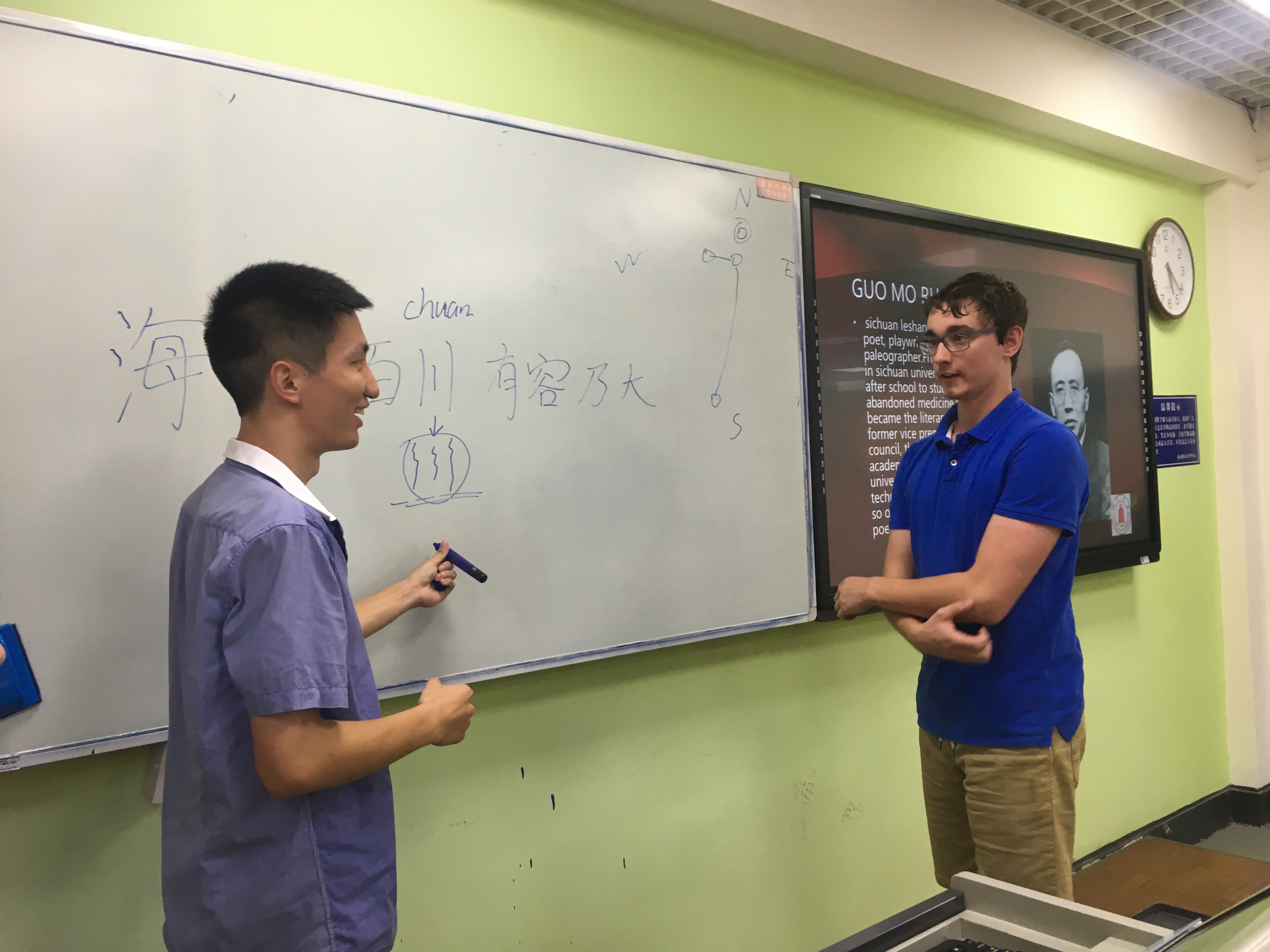同学开始介绍川大杰出校友,详细讲述了巴金、朱德和郭沫若三位校友的生平与贡献,还请外国友人上台来写“四川”两个字。介绍川大部分结束,下面由8bo体育