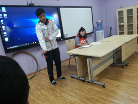 接下来,2015级6班张恩浩同学亲自示范了比赛中的意外处理方式。比如说重心不稳身体往后倾倒的时候务必记得用屁股着地,一定不能用手,因为手着地受力不均容易引起手腕或者手肘关节受伤。