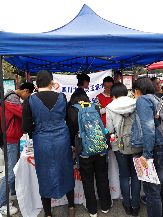 “腾飞”青年志愿者服务队在江安校区青春广场举办了“血车进江安”宣传活动之"清水润枯草,滴血唤新生"活动。本活动旨在通过发传单和做游戏相结合的方式,吸引校内同学,让献血活动得到很好的宣传。同时,这也有助于帮助一部分人消除对献血的误解。