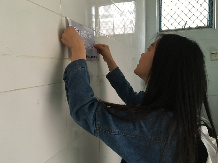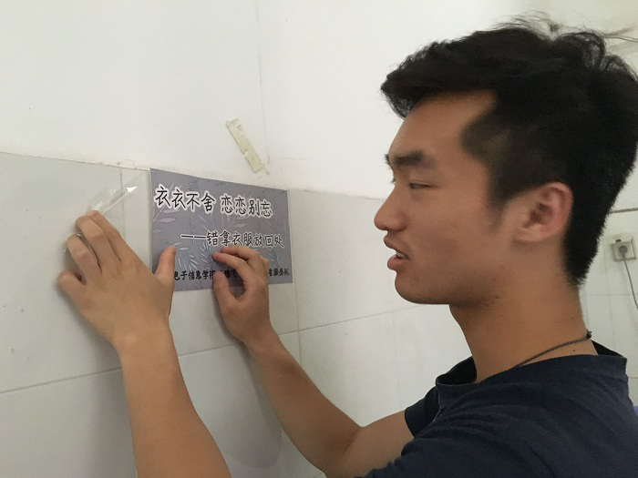 活动于16时30分准时开始。在宿管办的同意下,志愿者们有序进入2舍洗衣房开始张贴标语。志愿者们拿出事先准备好的卷尺量取确定高度并小心地粘贴标语。随后,志愿者们依次在3舍、11舍、20舍完成标语的粘贴。因挂衣钩需要用钉子固定,在完成贴标语工作后,志愿者们寻求宿管办师傅的帮助,在师傅的协助下顺利完成挂衣钩的添置。18时30分左右,活动结束,志愿者们对四个围合的洗衣房进行了简单清理。