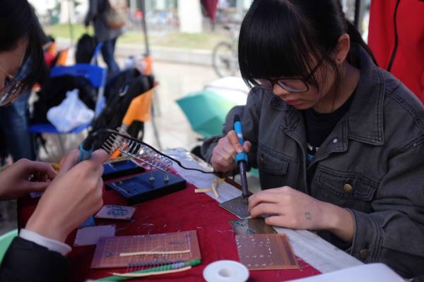 学科特色,了解电子,商学知识。本次活动共分为三部分:电子迷宫,有奖问答,电子名片焊接。在每一环节成功结束后,参与活动的同学们将会获得由主办方精心准备的奖品或取走亲手制作的电子名片。随后在早上9:00,陆陆续续有同学走向摊位,虽细雨绵绵,但同学们参与活动的热情丝毫不减,挑选题目竞答,在电子迷宫中探索道路,拿起电烙铁在“洞洞板”上设计制作出属于自己的个性名片。每一时段的志愿者也投入极大工作热情,坚守自己的岗位,引导同学们参与活动。本次活动于晚上6:00正式结束,大家纷纷拍照留念,并清理好了场地卫生。
