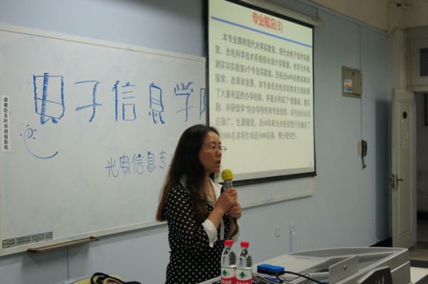 。紧接着王教授就光电信息科学与工程专业的历史及发展、招生规模以及教学条件等多个方面进行了全方位的讲解,同时指出了专业培养目标在于为国内外光电信息及相关事业服务的观点,并提出了专业培养对同学们的12条要求,令新生们对于本专业有了更进一步的了解。然后,王教授讲到了同学们最关心的问题:毕业去向。王教授用高于95%的就业率和较高的考研率与出国率消除了同学们对未来就业问题的担忧。另外,王教授还介绍了该专业的师资力量和科研团队,其研究的3D裸眼电视让同学们大开眼界。最后进行了学生提问环节,同学们和教授在这个环节中畅所欲言,使得同学们心中的疑惑得以解答。