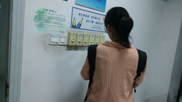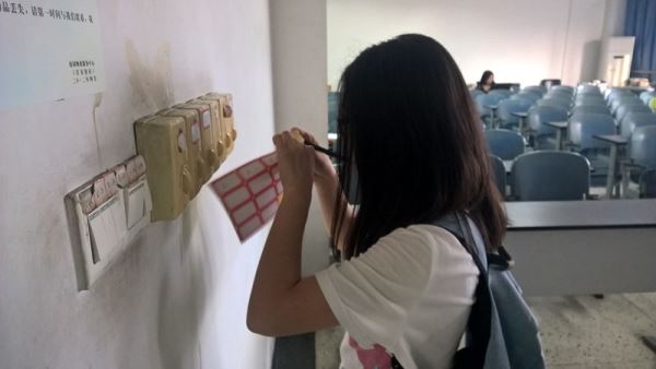 29日下午17:30,志愿者们准时到达江安校区第一教学楼A座大厅。志愿者们简单分成了两组后便积极投入工作之中。在检查教室时,志愿者们向教室中的同学解释了活动的内容,并表达了歉意。随后,志愿者们依次开启风扇的开关旋钮,观察并记录出现问题的风扇方位及问题明细。对于风扇标签模糊或损坏的教室,志愿者们认真确定每一个开关对应的风扇,再在携带的标签纸上写出明细,张贴到开关上。遇到上课的教室,志愿者们便记录下教室序号留待第二日检查。A座检查完毕后志愿者们分成两组赶赴D座和B座教学楼开展活动。19:00,第一天的活动宣告结束。