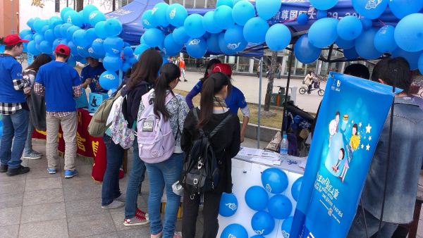 早上七点,青志队长江海燕和青志的干事们来到青春广场开始布置场地,八点半左右场地、摊位已经准备到位了,志愿者们也都换上了蓝色的志愿服,戴上了红色的志愿帽,开始今天的活动。他们给路过的同学发放宣传单,引领他们到摊位上做游戏、写寄语。很多同学被答题游戏吸引,纷纷前来参加其中,负责游戏这一环节的同学忙得不亦乐乎。同学们还在精美的心形本上写下了对自闭症儿童的寄语,留下了自己的一片心意。整个场地的同学都沉浸在了浓浓的蓝色中,沉浸在了大家对自闭症儿童浓浓的关怀之中。