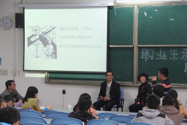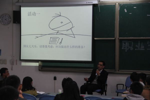 随后,任智先生以“七天乐”作为铺垫与同学们一起探讨目标与目的的关系,并表示职业规划侧重目的,让同学们深刻地意识到树立一个明确的目标是我们通往成功道路的必不可少的条件。