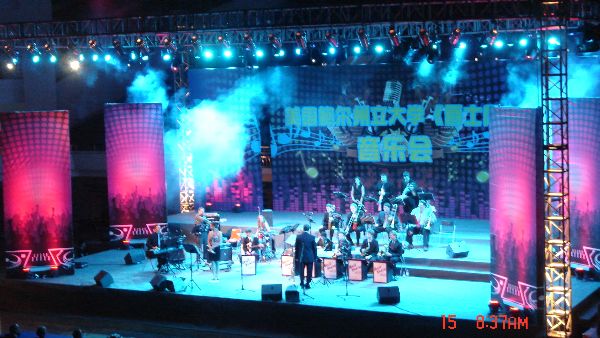 傍晚19点30分,爵士音乐会在四川大学校党委副书记李向成教授的致辞后拉开序幕。音乐会包括“本土爵士乐演奏”和“原创爵士乐演奏”。爵士音乐交流会不仅体现在对本土爵士乐展现,还体现在对爵士乐的完美演唱上。全英文的演唱带给观众不同于中国歌曲的美好体验和惊喜。耳目一新的精彩演唱更是将整个演出推向了高潮。晚上9点30分,场上奏起了音乐会的尾声。然而在观众的热情期待下,主持人代表现场观众与乐队指挥进行了简短的沟通,爵士乐队返场加奏新的曲目。跳动的音符,舞动的旋律,传递着不同语言、不同文化间的国际友谊,体现出音乐无国界的伟大精神。