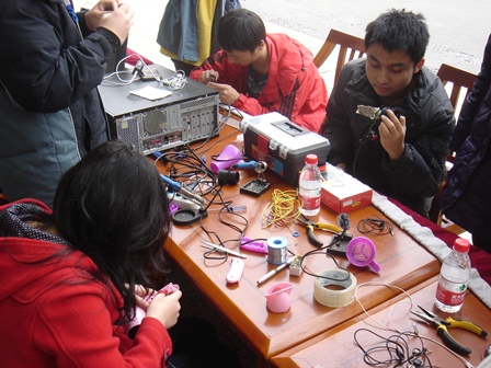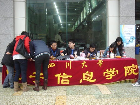研究生分会举办的。为了“服务同学,完善自我“的宗旨,志愿者们免费为同学们维修电脑、Mp3、耳机、台灯、优盘、电风吹、手电筒等。早早地我们的志愿者们桌上各种维修工具万用表、电烙铁、焊锡丝、螺丝刀等就一应俱全。因此上午开始桌前就聚集了不少需要帮助的同学,到了中午桌上不再仅仅是维修工具,也同样摆满同学们的各种坏掉电器。再看看我们的维修人员吧,忙着卸螺丝、上焊锡、查电路,真是恨不得一只手能当两只来用。他们不仅仅在忙着手里的活,还不停地向同学们讲述维修知识。一位同学看着自己的机器上拆下的电路板,看得出神,仿佛要忍不住借一把烙铁自己去焊。