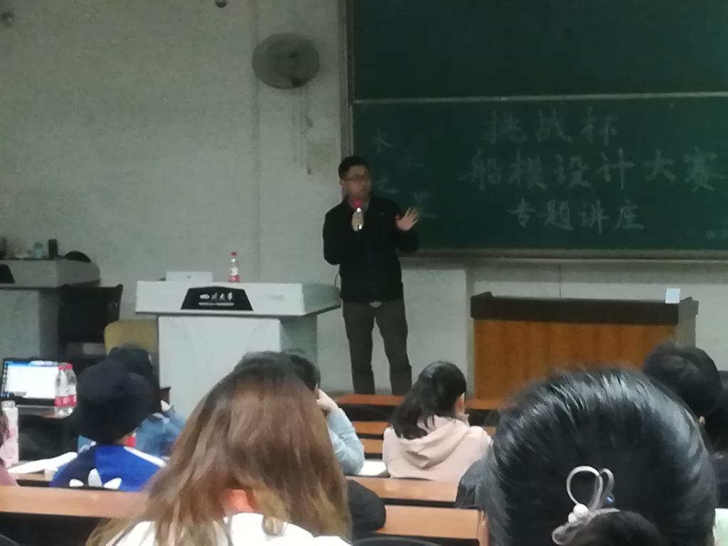 19:10分,宣讲会正式开始。主持人在众人的期盼中将宣讲会的目的和宗旨娓娓道来。接着由用主席团PPT生动的展示了“水上之星船模大赛”的发展历程。同时,也以图片的形式向各位与会者展示了学长学姐们的优秀的船模作品。除此之外,便是这个宣讲会的重头戏,主讲人陈雨教授,用他幽默风趣的言语为参赛者们传授了有关船模设计相关的一些经验和技巧,为选手们在船模设计时遇到的问题进行解答。与此同时,参赛选手们也对船模设计及此次宣讲会表现出极大的兴趣。除了认真听陈雨教授的讲座外,同学们也在下面积极的交流,各自的心得体会,场面十分积极热闹。通过这次宣讲会,参赛者们都从中得到了不少的收获,是他们对船模设计有了跟深一步的了解,对他们的设计有了一定的指导作用。相信听完这次宣讲会后,选手们会设计出更多更好的船模来的。