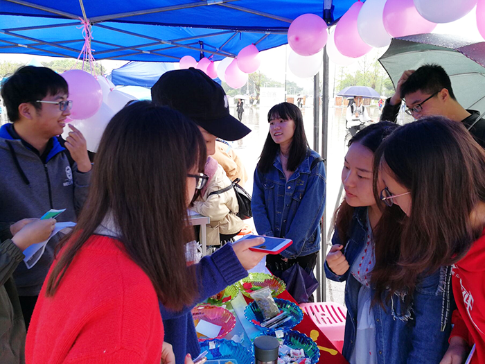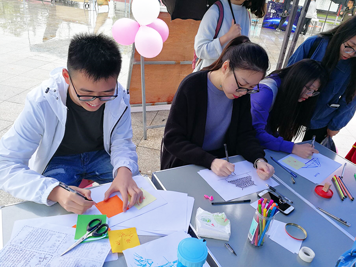分团委组织部干事早早在场地上准备好各种物资。活动开始后,同学们参与活动的热情并没有因为天气原因受到影响。本次活动分为四个部分:乡之味、乡之音、乡之貌、告白气球。同学们辨认各地小吃猜地名、听方言猜地名、画出家乡的标志性建筑获得三枚图章,获得品尝各地小吃的机会。最后进入告白气球的环节,在卡片上写下对任何人想说的话,之后举办方在活动结束后将同学们写下的话,有表白、愿望等,通过短信等方式传递给同学们想传递的人。