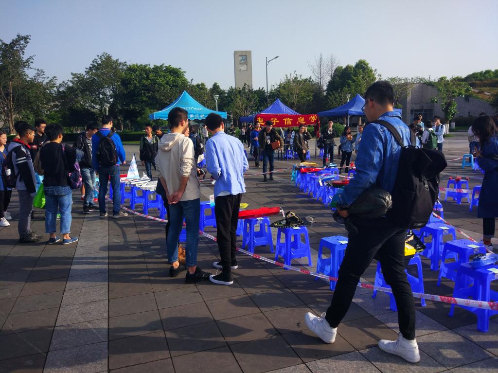 4月1日清晨,天刚蒙蒙亮,干事们便积极地开始了准备工作,在大家齐心协力下,7:30左右便已将凳子摆好成“w”型,并依次给凳子贴好船号的标签。8:30左右,参赛队员们陆陆续续的到场,将自己队的船体小心翼翼地放到相对应的凳子上。一眼望去,有体型较大的,也有小巧玲珑的;有赛车形状的,也有风筝样的;有老虎花纹的,也有海波浪花的…真是眼花缭乱啊!评委们根据船体的结构,创新、美观和环保程度对船只的外形进行打分。过往的同学也纷纷投来欣喜的眼光,在欣赏过各式各样的船体后,小伙伴们对自己最爱的船模投出一票。一些参赛队员们会向同学精彩地讲解自己船体的独特之处,希望可以拉到这宝贵的一票。