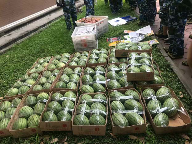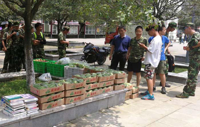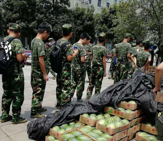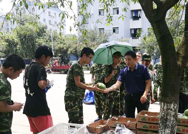 统一购买,每位参与军训的同学都可以获得一个三斤左右的西瓜、一个梨和一个苹果。活动分两批进行,女生于中午十二点在西园十一舍领取,由卢萍老师为她们分发。男生于十二点半在三八广场领取,由陈笃海副书记和孟滋常老师为男同学们分发。活动期间,同学们依次排队领取,整个过程井然有序。陈笃海副书记、孟滋常老师和卢萍老师认真、耐心地为每一位同学分发水果的同时,还对同学们军训期间的训练情况进行详细询问,问寒问暖。