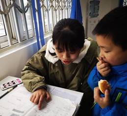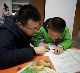 志愿者正在帮助小朋友解决作业中的难题 |