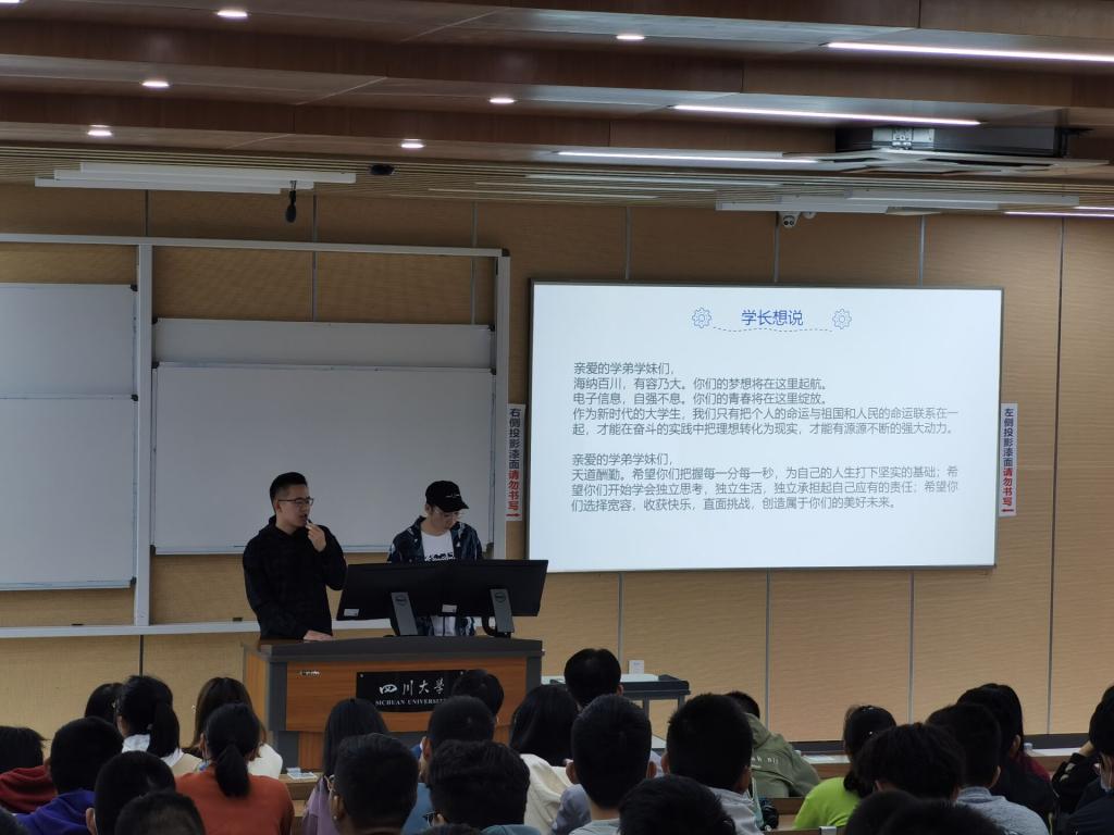 光电信息科学与工程专业毕业生,黄泽宇和王崇伟,这两位毕业生向新生们介绍了光电信息科学与工程专业的相关情况,对新生们的专业意识进行了启蒙。