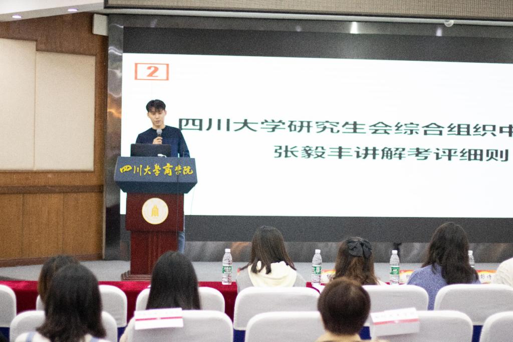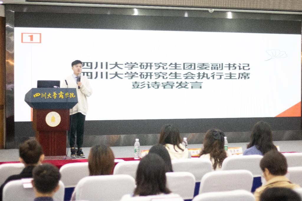 首先,彭诗睿主席发表会议讲话,希望各级研究生会的同学能够充分发挥研究生会的平台作用更好地服务同学、完善自我。然后,彭诗睿主席宣布四川大学十佳研究生会获奖名单,张毅丰主任为各代表颁奖。