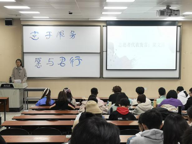 的梁文清同学代表志愿者进行了演讲,表达出新干事们对加入青年志愿者服务队大家庭的欣喜,以及对志愿服务工作的向往与憧憬。