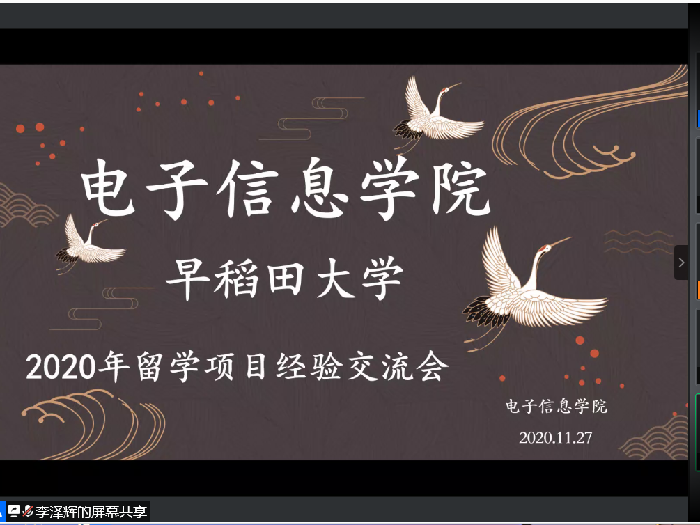 首先邀请到2016级优秀毕业生李德佶学长对学校情况进行了详细介绍。首先,李德佶学长谈到了校园环境,早稻田ISP校区坐落在日本北九州,是一个很清静很适合学习研究的地方。虽然地处偏僻,但便利店、医院等一应俱全。