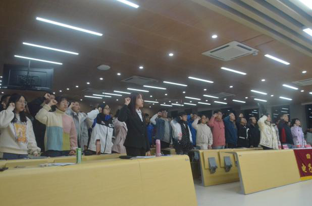 首先,两位主持人介绍并欢迎了到场的领导、老师及嘉宾,此次活动正式开始。然后在主持人的带领下,全体学员起立奏唱团歌并重温了入团誓言。接下来,邱丽如同学作为学生代表发言,他表达了自己对于共青团的了解并分享了自己关于抗疫的体悟。而后,由主持人宣布了团校考核规则。