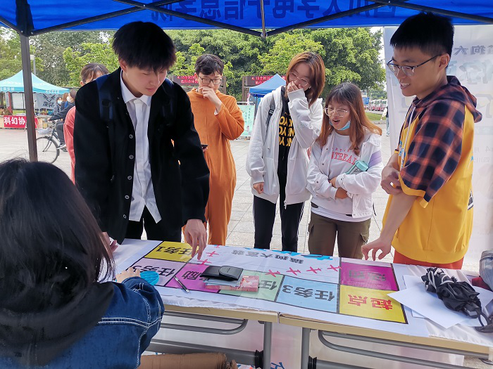 在活动负责人向志愿者们详细讲解完活动规则后,各位志愿者都积极地参与到宣传活动中。活动主要由“猫狗大富翁”小游戏构成,参与人员通过完成不同任务了解到不同的科普小知识并获得相应奖品。活动总共有6大任务,每个任务都有助于参与人员学习到有趣的流浪猫狗小知识。活动开始没多久,活动中的“猫狗大富翁”小游戏很快就引起了多名路过同学的注意,志愿者们也十分热情地邀请了同学们参与活动。活动过程中充满了欢声笑语,参与的同学们不仅了解到了关于流浪猫狗的小知识,还收获了快乐。