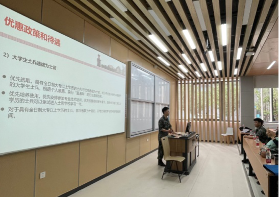 首先,会前观看了宣讲视频,强化同学们服兵役的责任感和参军保卫祖国的意识。接着学工部李宜老师做了致辞。致辞中李宜老师讲到大学生征兵入伍的意义。大学生征兵让中国知识分子行列当中拥有了军人气质。军队的锻炼环境具有特殊性,它培养人的坚强意志和爱国精神,同时,中国军队有不少在战争年代因某人或某一场战斗闻名全军的光荣部队,在这样的部队接受传统教育,能加强自己的荣誉感,感受前辈军人英勇善战,无畏的牺牲精神。随后,由2017级朱佳兴同学介绍了他的部队生活并且讲解了大学生参军的优惠政策和待遇。主要有两个方面,首先是学费减免,国家对应征入伍义务兵役的高校学生,在入伍时对其在校期间缴纳的学费实行一次性补偿或获得的国家助学贷款实行代偿。其次是学历政策服役前被高校录取的,退役后可以选择继续复学,复学后免修军事技能课,直接获得学分;经学校同意并履行相关手续后,可转入本校其他专业学习