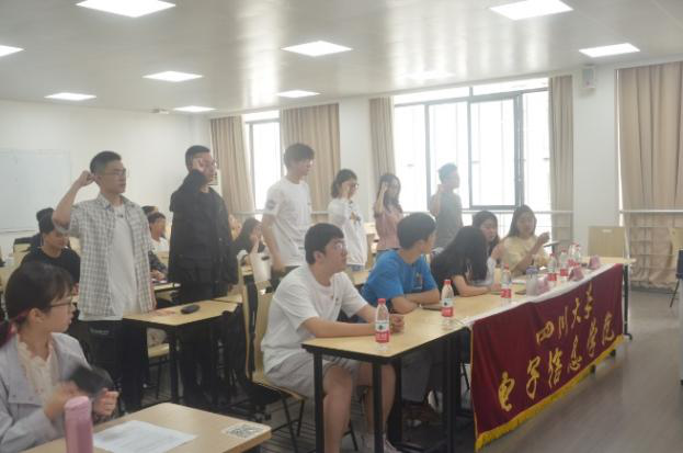 会议开始,全体人员齐唱国歌,伴随《义勇军进行曲》的旋律响起,大家庄严肃穆,注视着国旗,齐声唱响国歌。紧接着主持人宣布新团员名单,戢耀平、徐奥林、潘柞舟、魏晓敏、孙瑶、安成昊六位同学正式加入共青团。同时大会上强调了入团的意义:中国共产主义青年团是中国共产党领导的先进青年的群众组织,是广大青年在实践中学习中国特色社会主义和共产主义的学校,是中国共产党的助手和后备军。随后老团代表向新团员颁发团章、团徽后,新团员开始入团宣誓。每位宣誓人的语气中透露着坚定。宣誓完毕后,入团介绍人代表宣读《团章》中有关团员义务和权利的条款。
