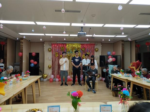 5月9日下午,志愿者们提前到达大厅布置生日活动现场,为老人们准备好糖果、花生和生日蛋糕。下午14:30,活动正式拉开帷幕。