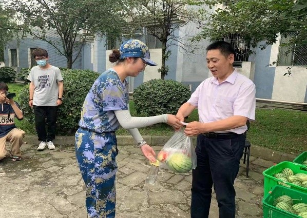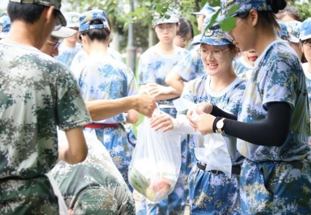 还为每一位同学准备了牛奶。同学们手上提着水果,笑语声不断,与老师们开心地交谈着。回到寝室后,许多同学就迫不及待地开始享用水果。西瓜清凉,桃子香甜,美食好像驱散了军训期间的劳累,带来一丝夏日清凉的惬意。