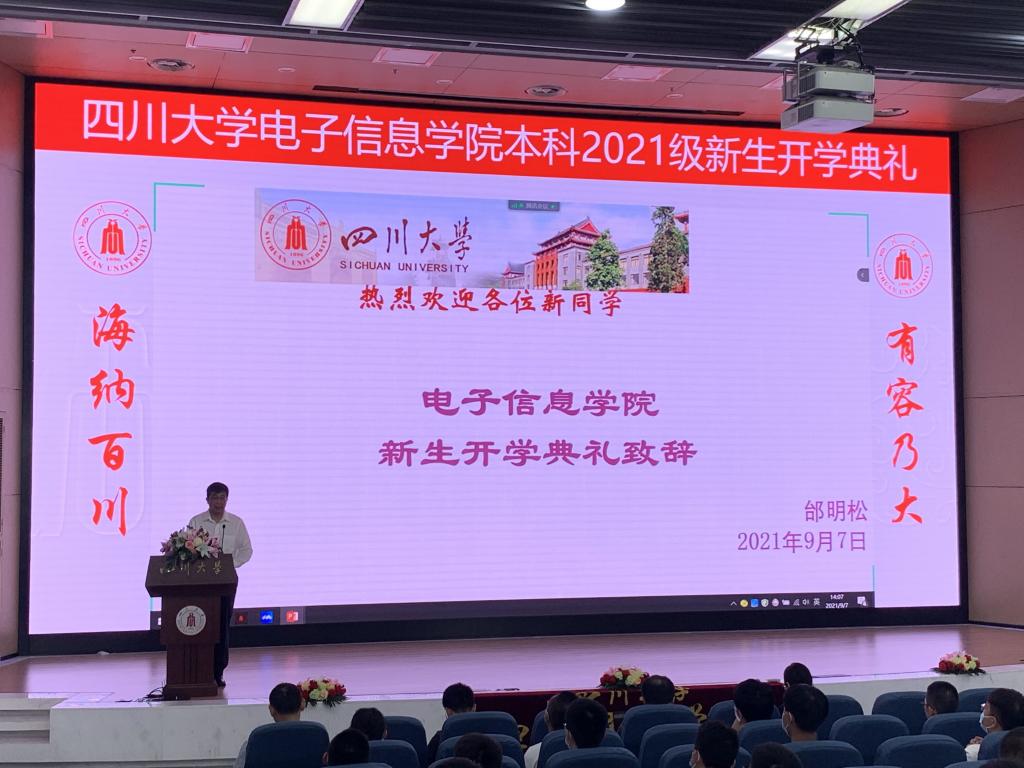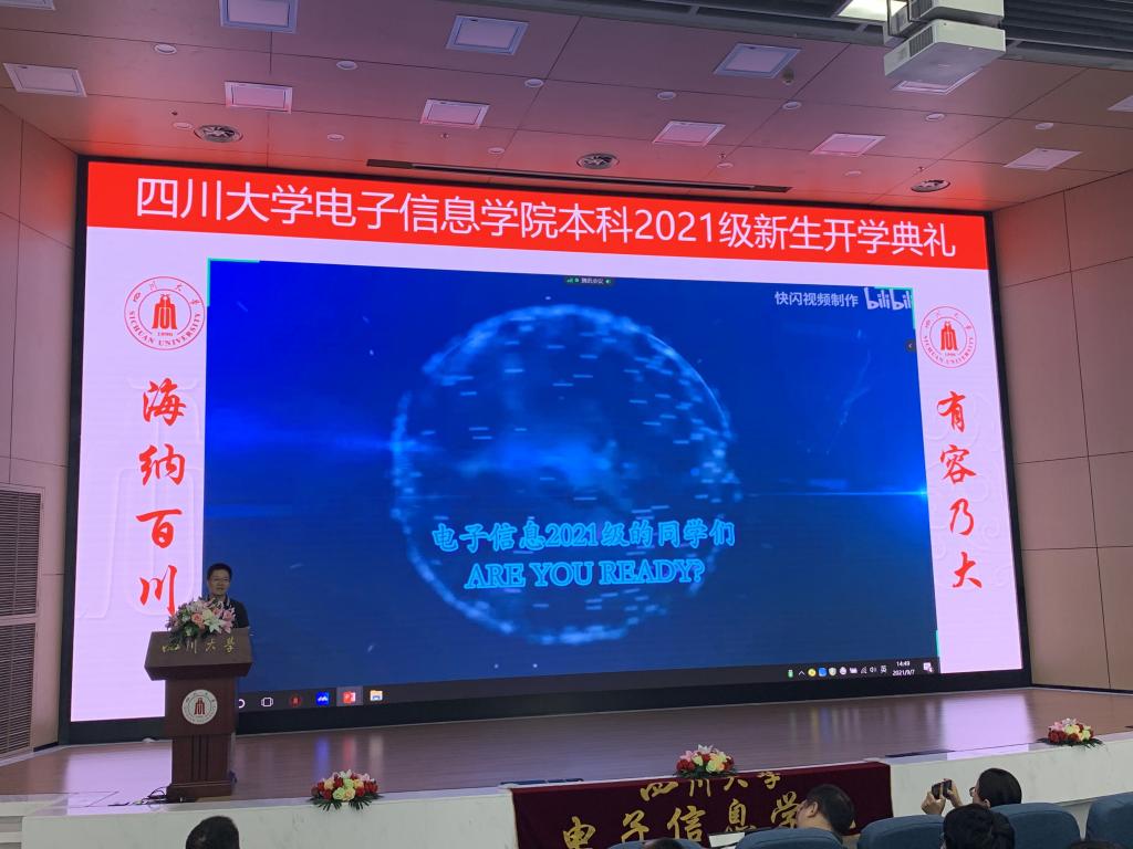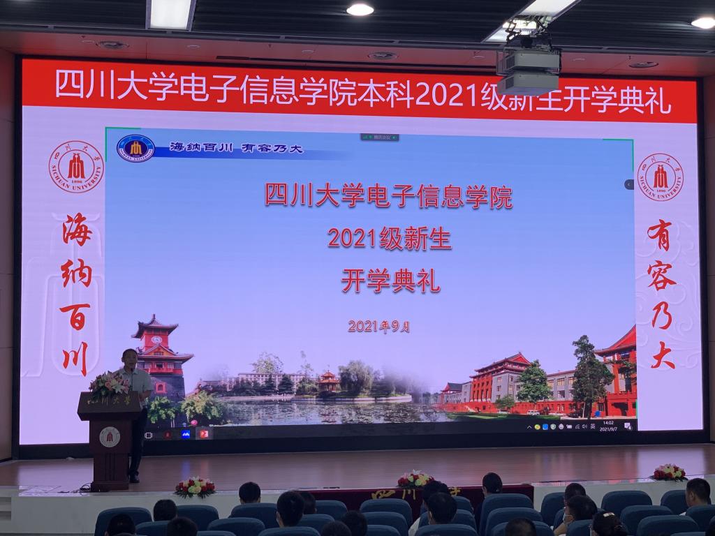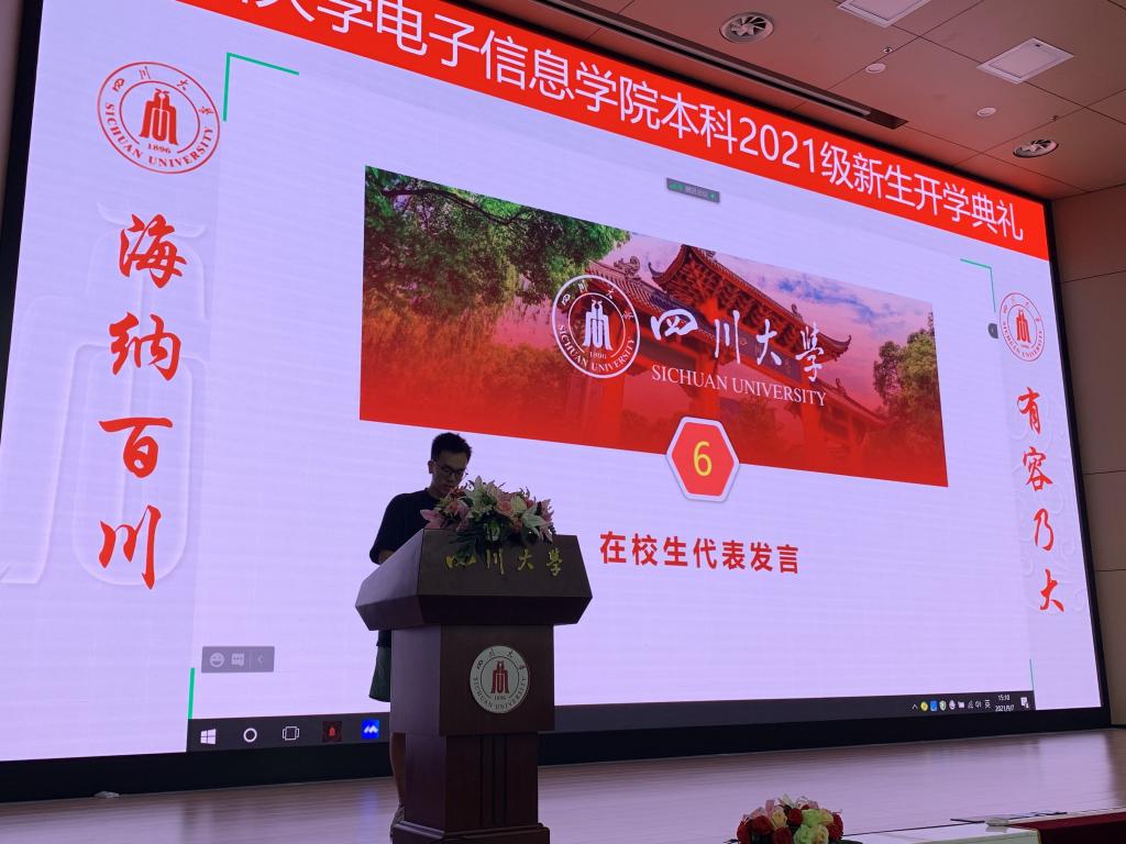 的良好的科研平台上努力学习。新生代表王心怡同学的发言让人看到了电子信息2021级本科生的决心。她这样说到:报道前和报道时受到领导,老师与学长的关照,十分感激。如今手握川大的录取通知书站在这里,她十分期待丰富多彩的大学生活,呼吁同学们在大学里乐学善学,严于律己;但行前路,问心无愧;培养兴趣,开拓演界;致敬先贤,奋力拼搏。