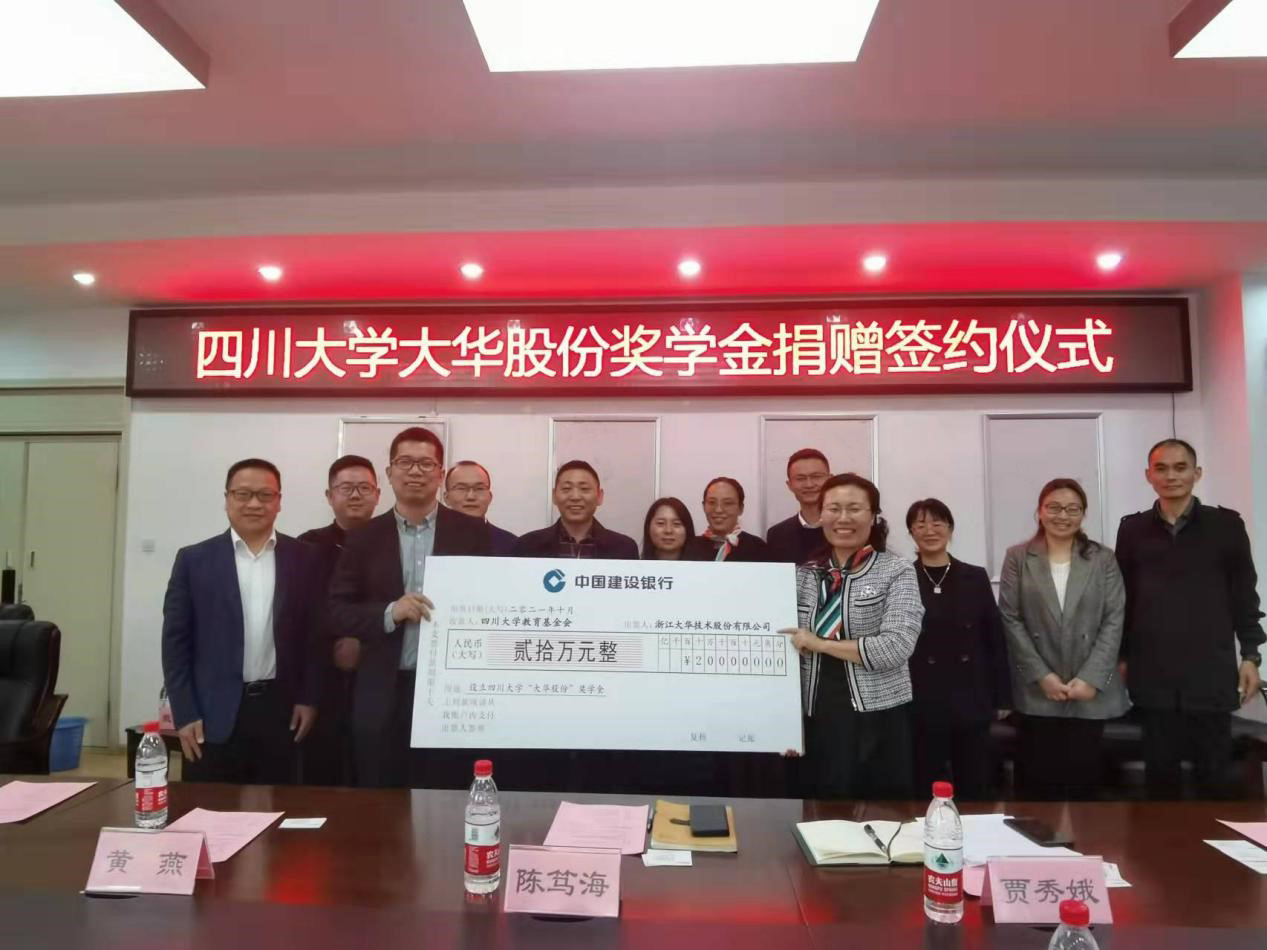 四川大学教育基金会副秘书长贾秀娥与江大华技术股份有限公司人力资源总监沈海峰分别代表双方签署了四川大学“大华股份”奖学金捐赠协议,贾秀娥作为学校代表接受捐赠,并向沈海峰颁发捐赠证书,自此,四川大学“大华股份”奖学金正式成立。