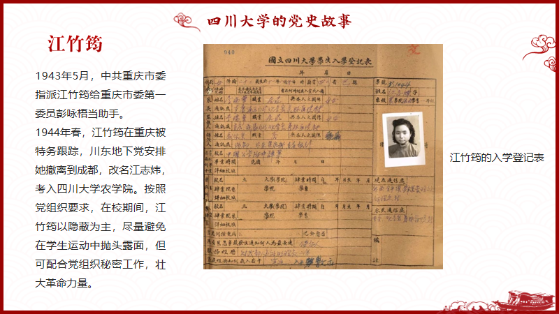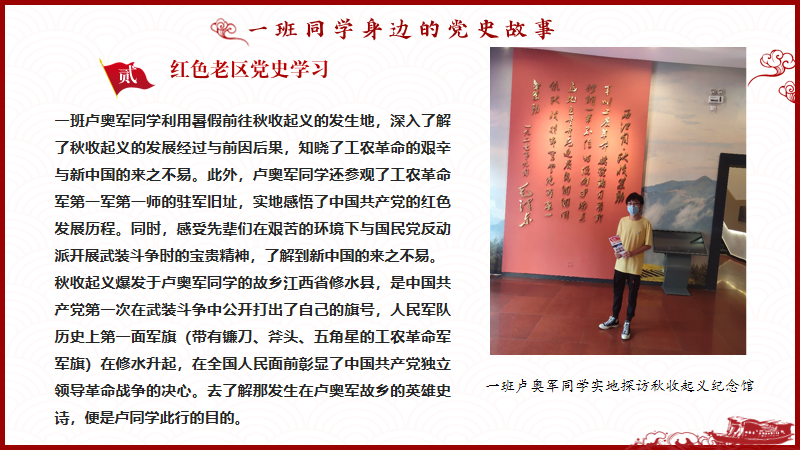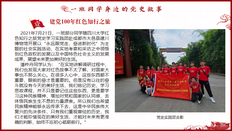 班会伊始,同学们在领学人的组织下,集中学习了中共党史,对党史的重要意义、发展历程以及时间脉络有了准确的了解。紧接着,领学人生动讲解了川大的党员故事。江姐孜孜不倦的求学精神和顽强战斗的革命精神令同学们令感动,恽代英先生不顾个人生死、不畏艰难险阻,勇敢传播马克思主义的伟大事迹令同学们敬佩。班会的最后,潘作舟和杨文皓同学讲述了自己的党史学习经历,即曾随四川大学红色知行之旅党史学习实践团,赴成都市大邑县建川博物馆开展以“永远跟党走,奋进新时代”为主题的社会实践活动,在实地考察和采访之中领悟到红色政权的发展历程以及中国特色社会主义的发展成果。