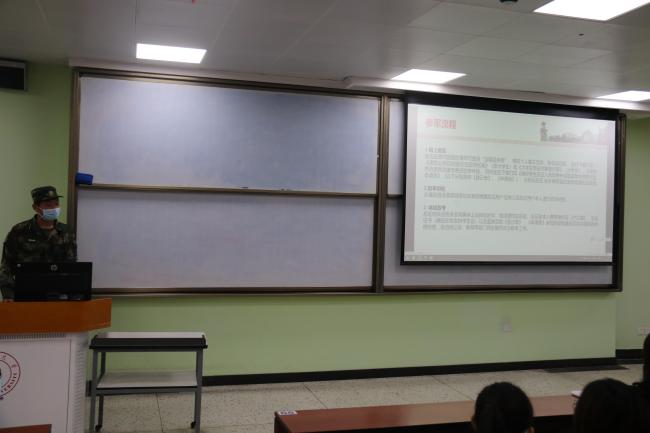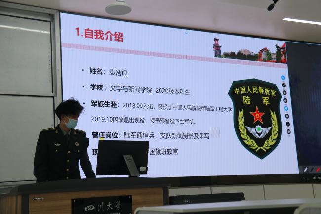 会议中,2020级文学与新闻传播专业学生袁浩翔和2019级材料科学与工程 专业学生刘恭增身着军装,进行了征兵工作的宣讲。在完成自我介绍后,两位同学首先谈及其参军经历和自我感受,向同学们讲述了他们在军队中的日常训练以及执行的任务。随后,他们以参与四川大学军训任务及2021年四川大学国庆升旗任务为主线,介绍了自己的退伍生活。最后,他们就参军的报名流程以及入伍的优惠政策及待遇进行了介绍,圆满完成了本次的宣讲。8bo即时比分