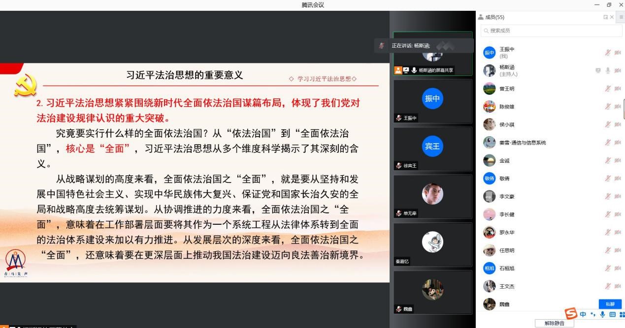 杨斯涵同志主要介绍了关于习近平法治思想的核心要义。习近平法治思想用“十一个坚持”系统阐述了新时代推进全面依法治国的重要思想和战略部署,“十一个坚持”为新时代推进全面依法治国提供了根本遵循。思想是行动的先导,理论是实践的指南。推进全面依法治国是国家治理的一场深刻变革,必须以科学理论为指导,加强理论思维,不断从理论和实践的结合上取得新成果,总结好、运用好党关于新时代加强法治建设的思想理论成果,更好指导全面依法治国各项工作。要认真学习领会习近平法治思想,吃透基本精神、把握核心要义以及习近平法治思想的重要意义。