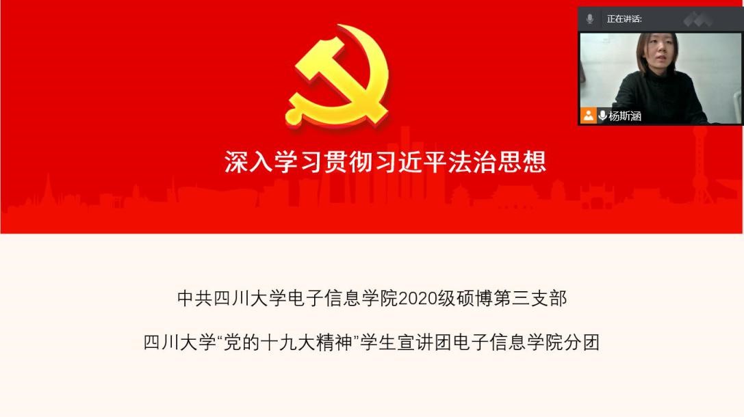 分团杨斯涵作为宣讲人在线上开展了关于深入学习贯彻习近平法治思想的宣讲。8bo即时比分