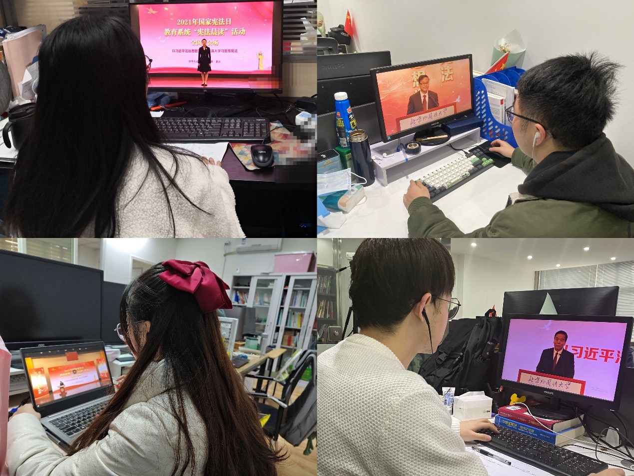 其他学生大多数在寝室、实验室、研讨室等地方采用自行学习宪法的方式,同步观看“宪法晨读”直播活动。