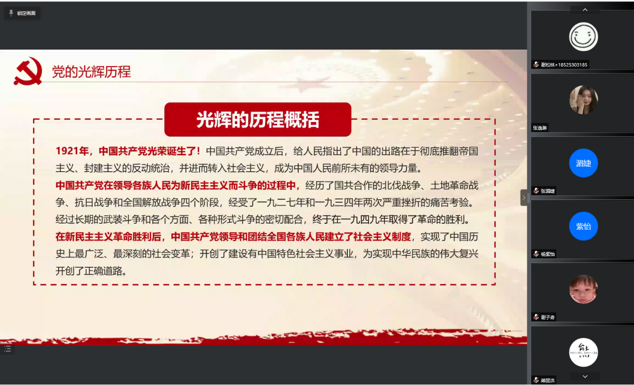 党课回顾了党的光辉历程,阐述了学习党史的重要意义。在一百年的接续奋斗中,党领导人民创造了伟大历史,铸就了伟大精神,形成了宝贵经验,使中华民族迎来了从站起来、富起来到强起来的伟大飞跃。党史是全党的宝贵精神财富,是中华民族历史文化的重要组成部分。学习党史,能够牢记初心,坚定理想信念,深刻认识党的十八大以来党和国家事业取得历史性成就、发生历史性变革的进程。