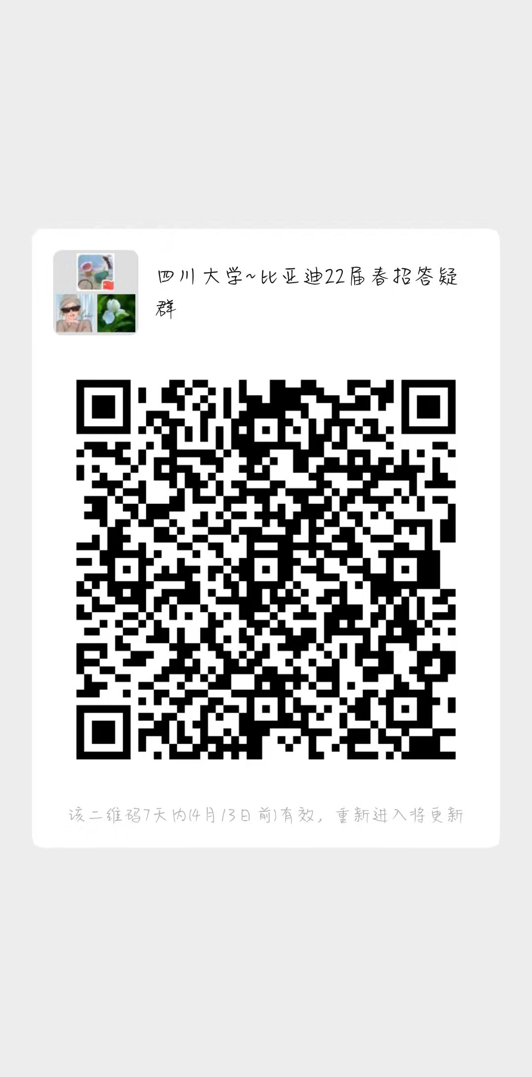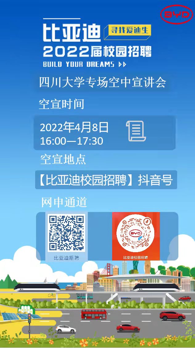 【比亚迪股份有限公司】2022春招线上宣讲会正式启动啦!学校:四川大学时间:2022/4/816:00-20:00宣讲形式:抖音关注“比亚迪校园招聘”简历投递方式:关注“比亚迪招聘”公众号 选择菜单-校园招聘-简历投递简历投递邮箱:[email protected]联系电话:18846770194工作地点:全国城市任选欢迎各位呼朋唤友来参加哈