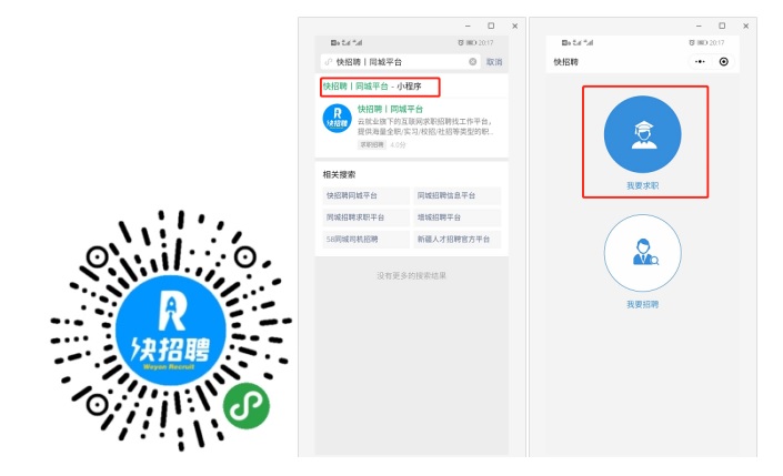 ②通过微信小程序“快招聘|同城平台”注册简历可免费视频应聘。