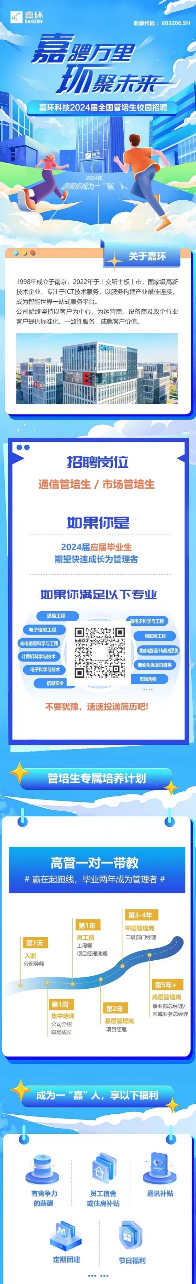 【公司简介】嘉环科技股份有限公司于1988年在南京创立,2022年在上交所主板上市,国家级高新技术企业,专注于ICT 技术服务,以服务构建产业最佳连接,成为智能世界一站式服务平台。先后获得江苏省软件核心竞争力企业(规模型),省级软件企业技术中心、南京市创新型领军企业等荣誉称号。主营业务:信息通信系统综合服务、数智化+双碳综合服务、教育培训综合服务,为主流设备厂商,中国移动、中国电信、中国联通、中国铁塔、广电等运营商,政企行业客户等,提供端到端全业务、全技术、全国落地、标准化、一致性综合服务。目前,业务覆盖全国31个省级行政区域,200+地市。