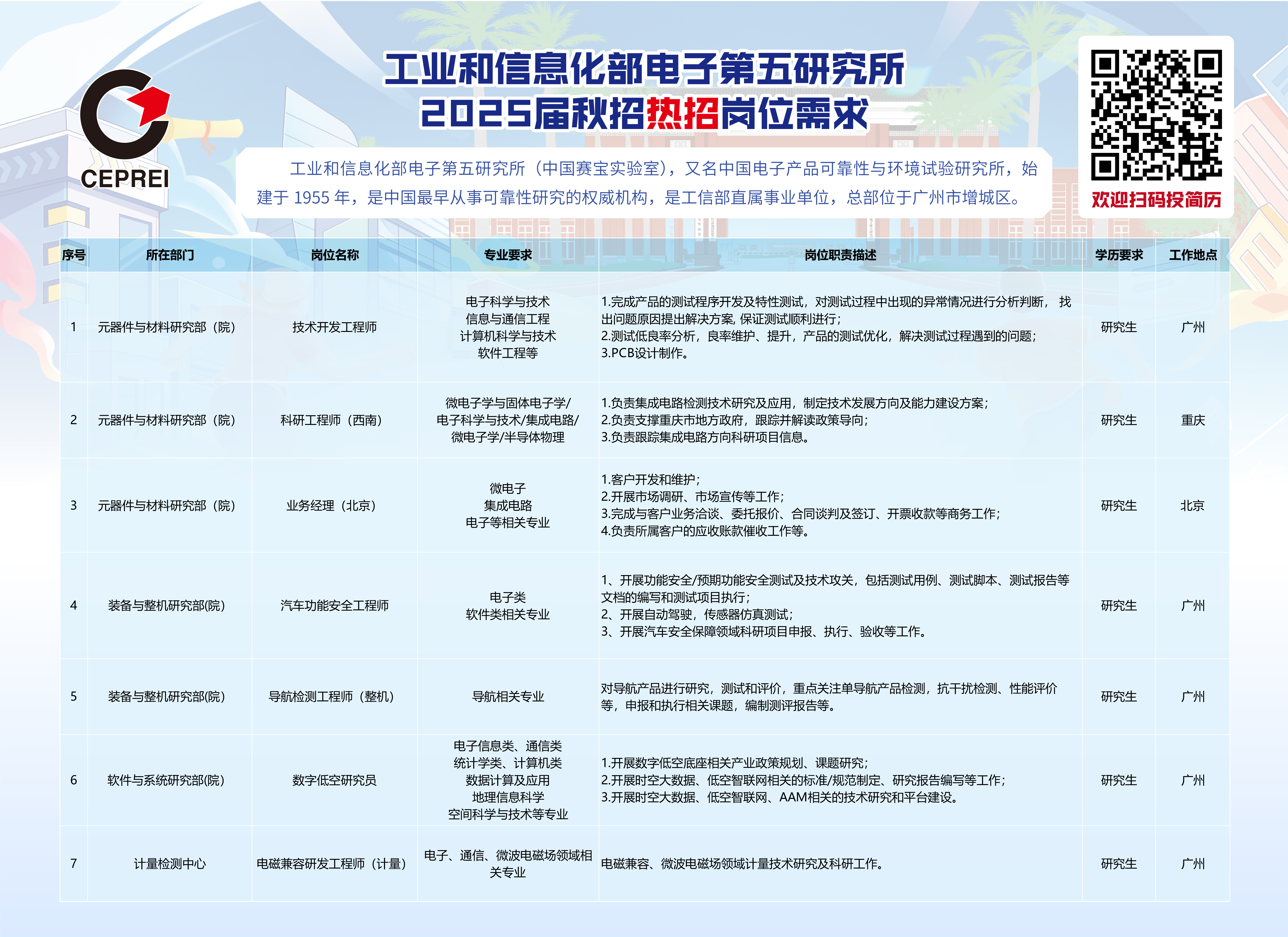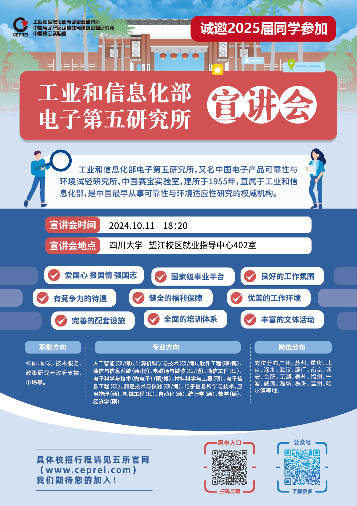 10月11日 18:20 就业中心402 工业和信息化部电子第五研究所2025届校园招聘