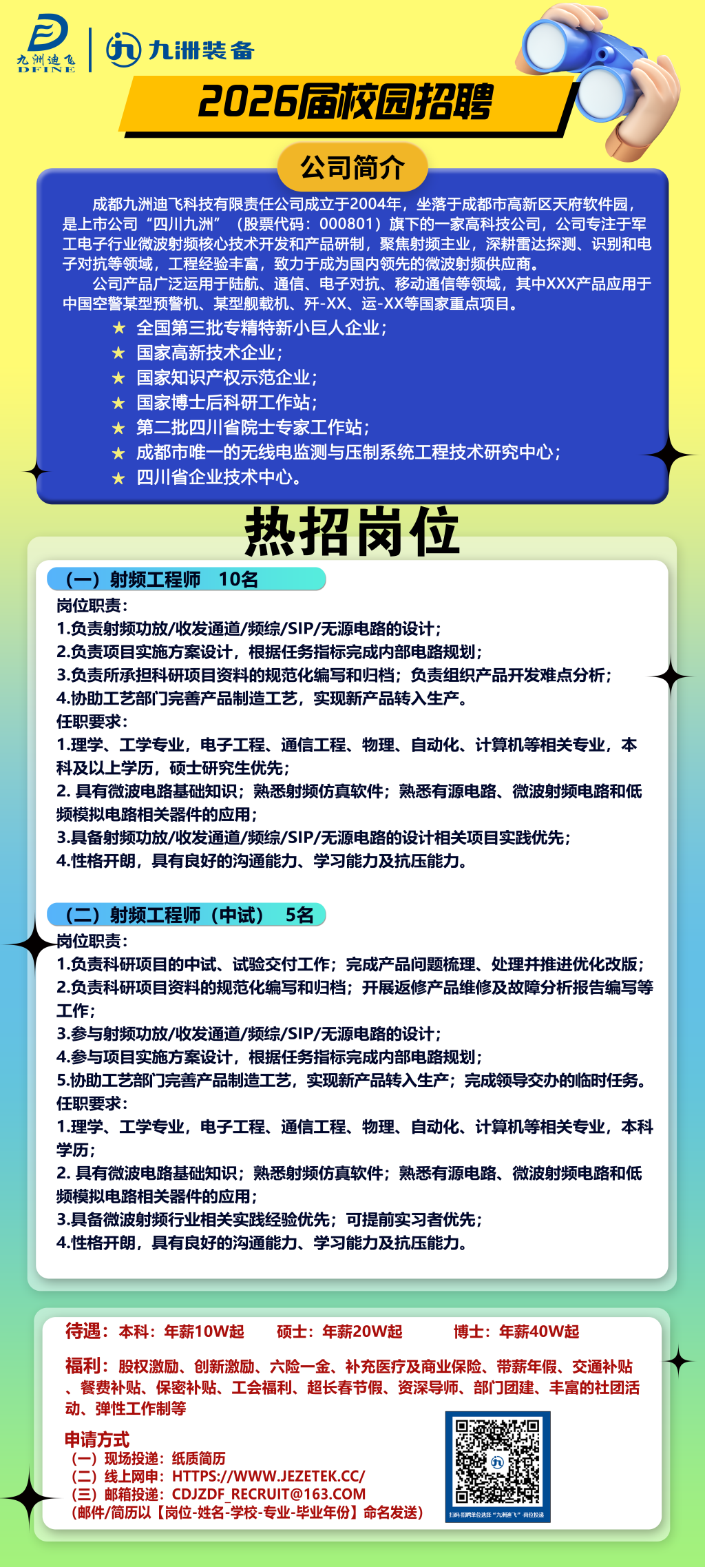 九洲迪飞(JG国企)今天拟在贵校开展宣讲招聘,主要针对2026届电子类专业学生,图片是招聘具体岗位信息