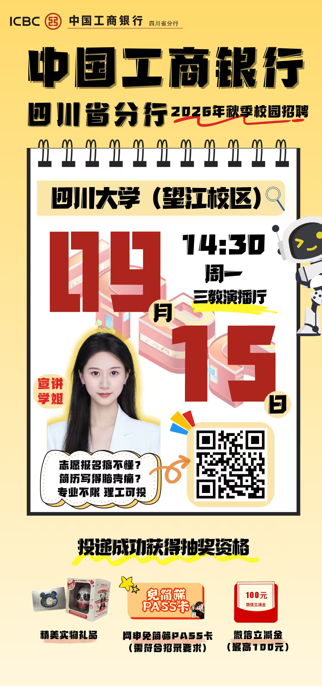 #工行校园招聘线下宣讲会-四川大学(望江校区)专场# 专业不设限、平台大、机会多、待遇好!