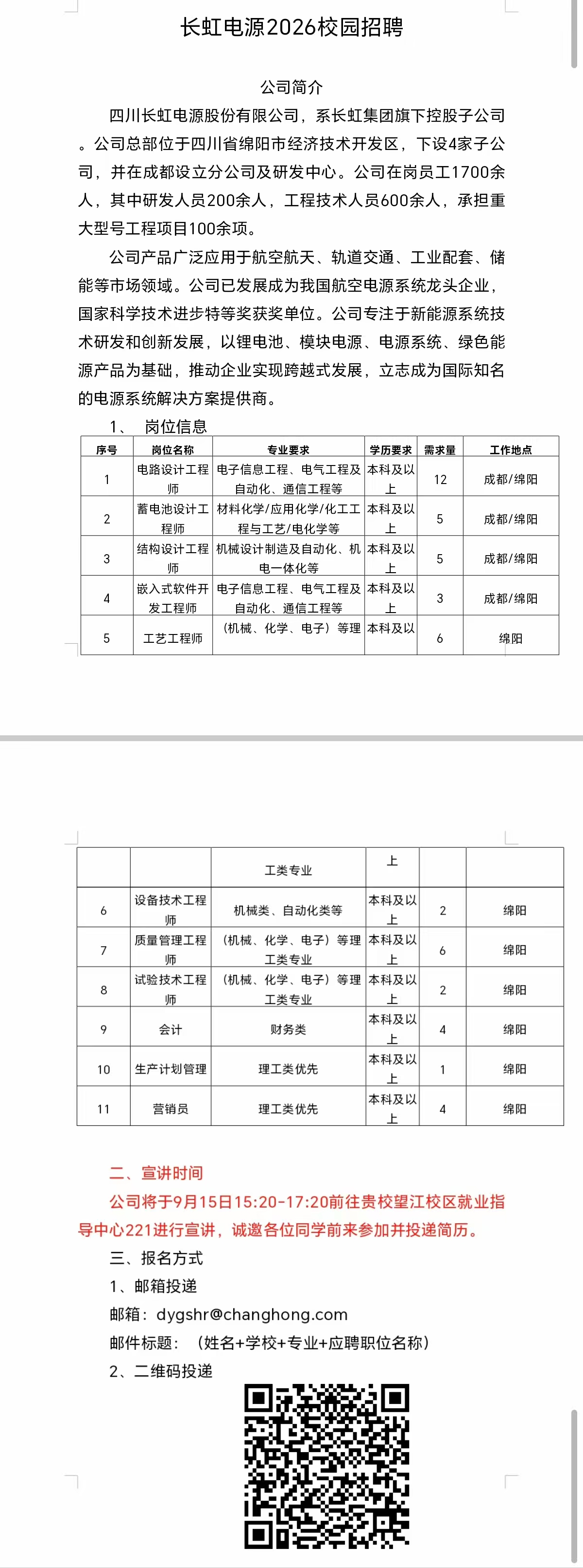 9.15 15:20 就业指导中心221 长虹电源校园招聘