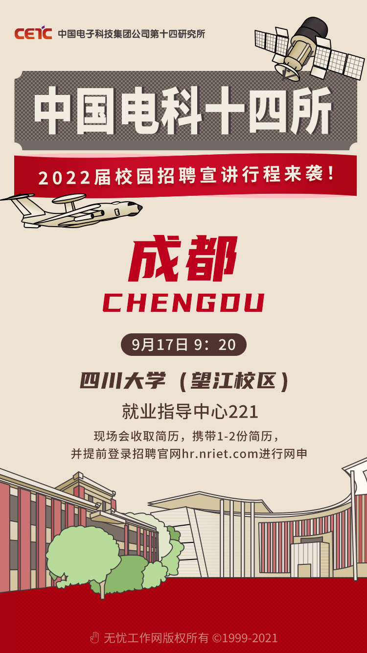 中电14所2022届校园招聘四川大学专场宣讲会将于9月17日(周五)9:20-11:20,在就业指导中心221进行,现场收取简历,17日(周五)下午会在就业指导中心217、218进行面试。请提前登录官网:hr.nriet.com进行简历网申,也欢迎各位小伙伴邀请自己的小伙伴进微信群,了解更多宣讲会详情和招聘资讯哦!
