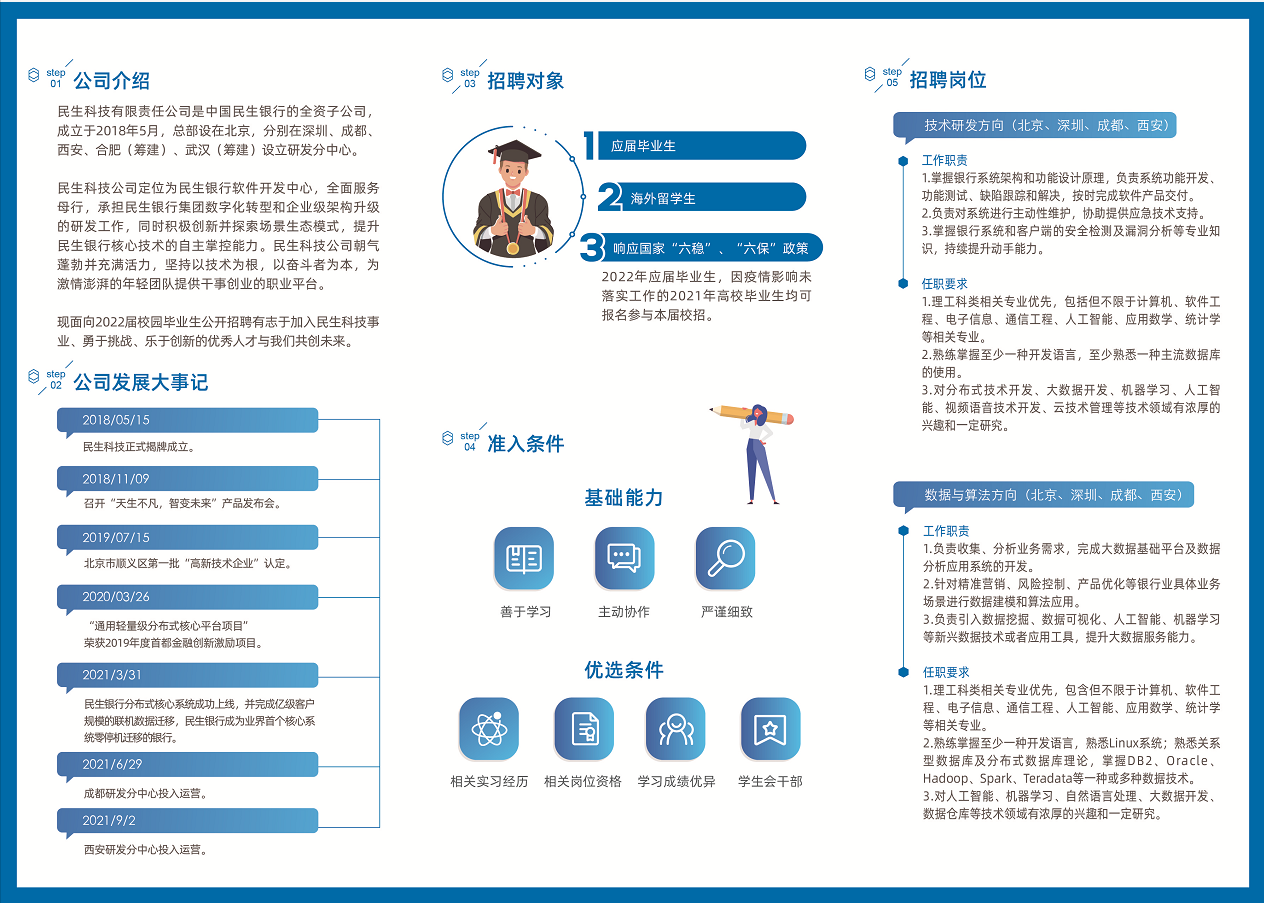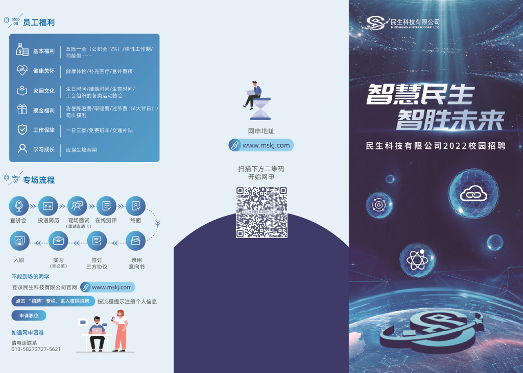 “智慧民生,智胜未来!”民生科技有限公司2022届毕业生秋季校园招聘火热开启!技术研发方向、数据与算法方向两个岗位方向,北京、成都、西安、深圳四地任你选择!